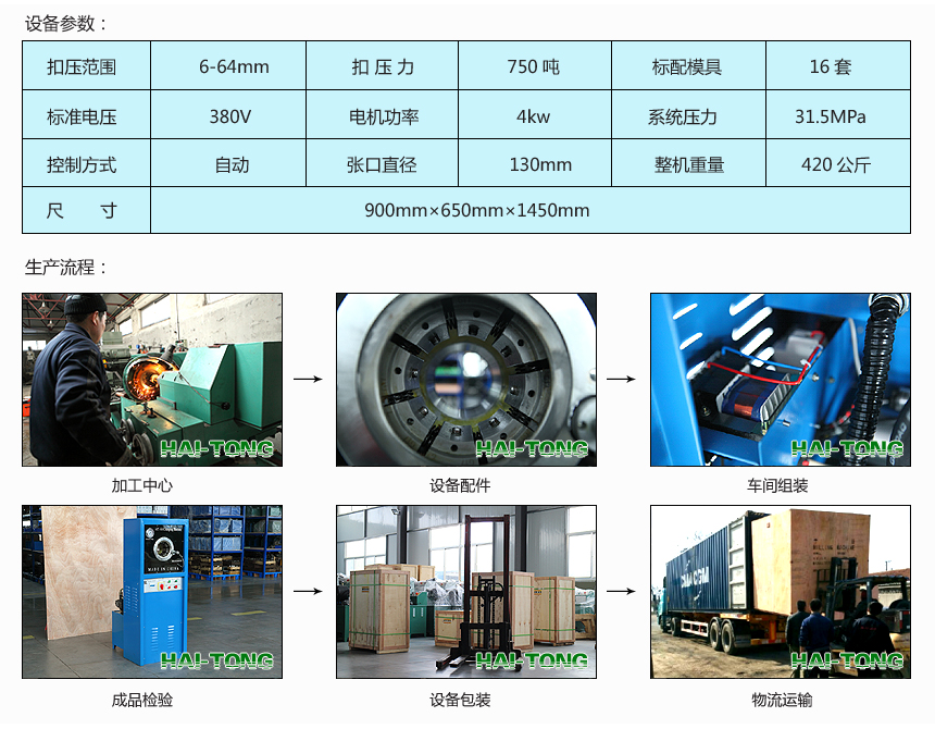 HT-64型扣壓機是我公司一款扣壓速度快,扣壓力大,張口直徑大,噪音低,性能穩定的產品。是我公司長銷不衰的產品。